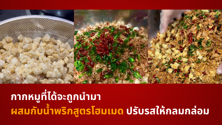 3.กากหมูที่ได้จะถูกนำมาผสมกับน้ำพริกสูตรโฮมเมด ปรับรสให้กลมกล่อม