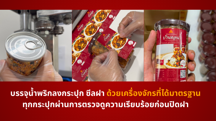 4.บรรจุน้ำพริกลงกระปุก ซีลฝา ด้วยเครื่องจักรที่ได้มาตรฐาน ทุกกระปุกผ่านการตรวจดูความเรียบร้อยก่อนปิดฝา สำหรับเรา นี่คือช่วงที่รู้สึกสบายใจที่สุด เพราะน้ำพริกโฮมเมดหนึ่งวันกำลังจะจบลงอย่างสมบูรณ์และพร้อมส่งคุณภาพถึงมือลูกค้าทุกคน